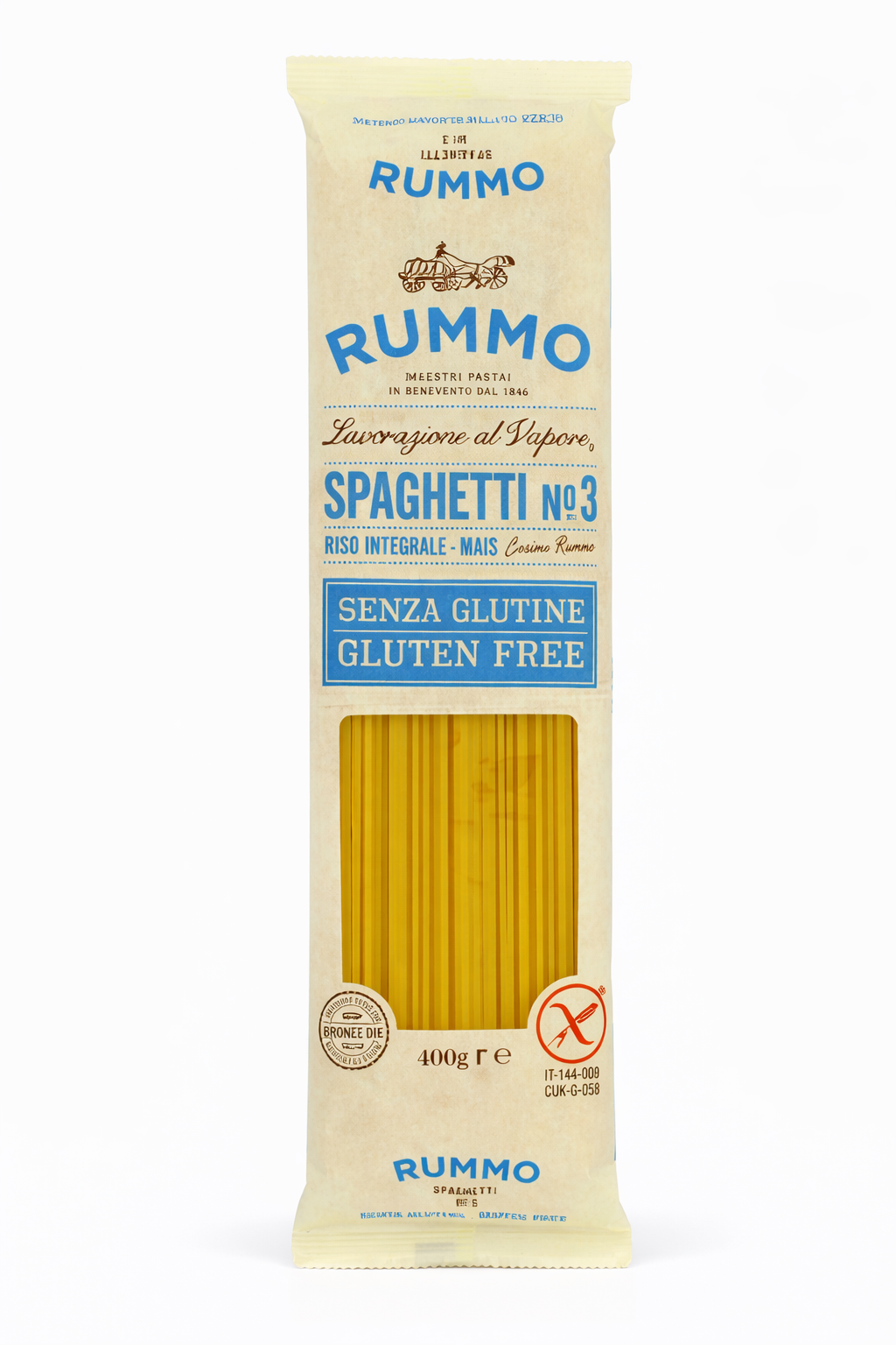 Bezglutenowe spaghetti Rummo No.3 to najwyższej jakości włoski makaron stworzony z mąki ryżowej i kukurydzianej. Dzięki unikalnej recepturze zachowuje sprężystość i zawsze gotuje się al dente (czas gotowania: 10 min). Idealny dla osób na diecie bezglutenowej, które nie chcą rezygnować z tradycyjnego smaku. Doskonale łączy się z sosami Bolognese, Carbonara oraz owocami morza.
