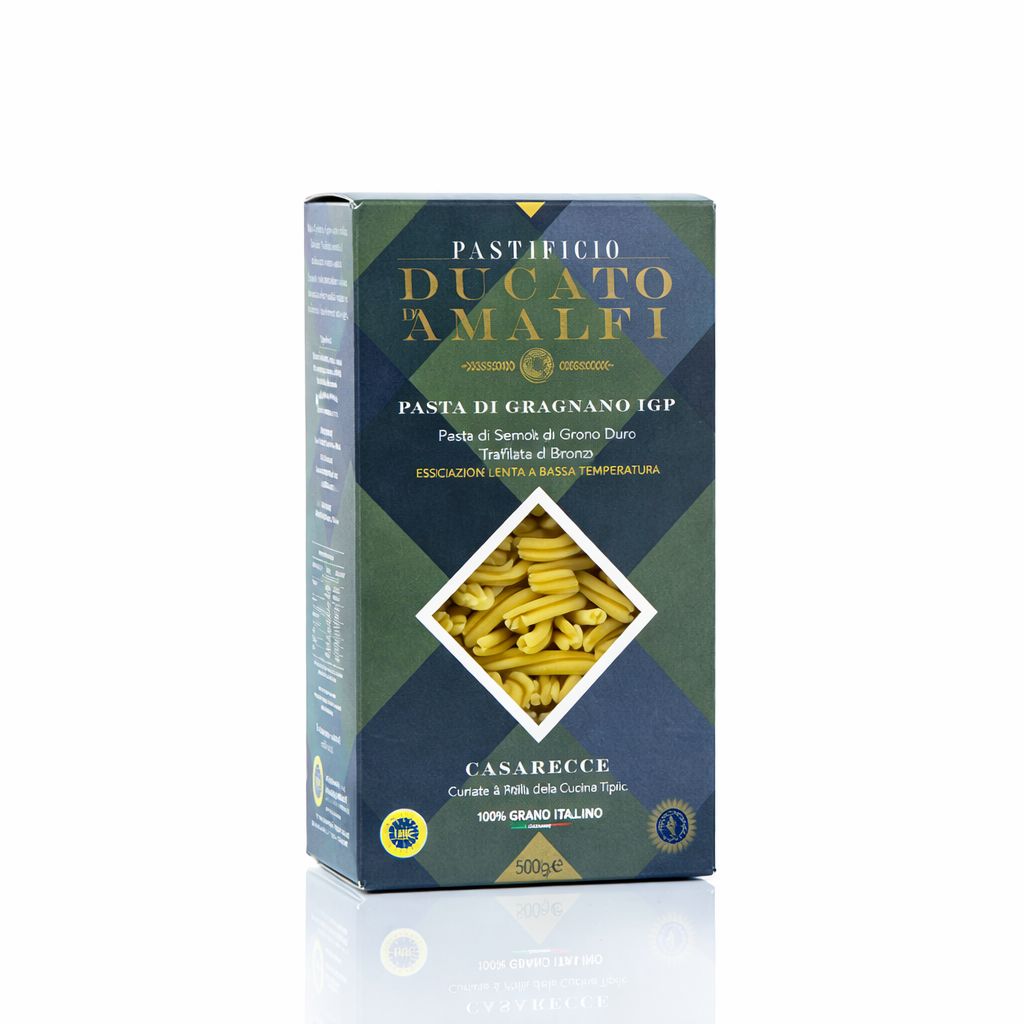 Casarecce z Gragnano IGP to wyjątkowy włoski makaron o kształcie zwiniętego pergaminu, wywodzący się z Sycylii. Produkowany rzemieślniczo przez Pastificio Ducato d’Amalfi z matryc z brązu. Dzięki porowatej strukturze i specyficznemu kształtowi, doskonale zatrzymuje sosy w swoim wnętrzu. Idealny do Pesto alla Siciliana, sosów warzywnych (np. z bakłażanem) oraz mięsnych ragù. Produkt certyfikowany IGP.