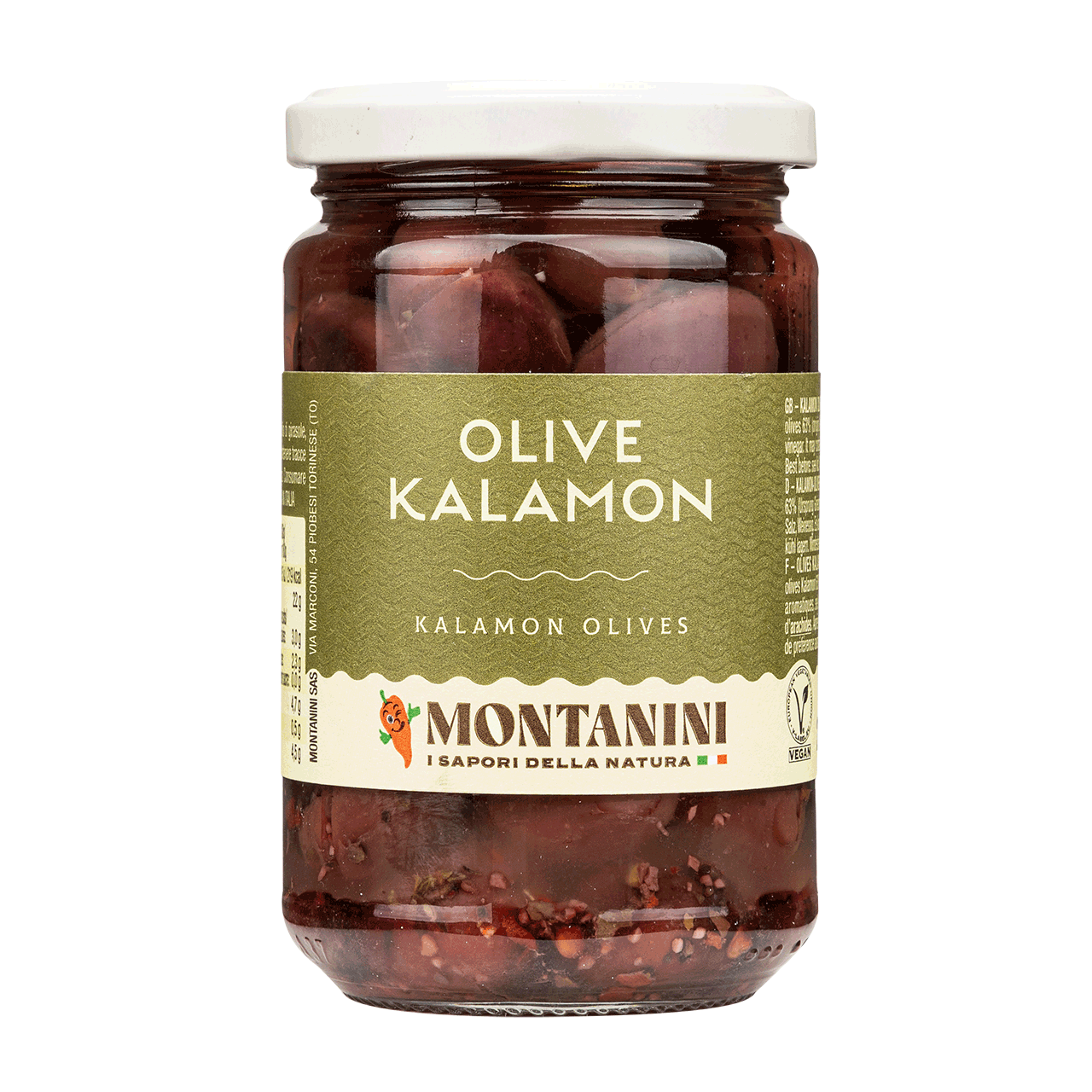 Olive Kalamon Montanini – tradycyjne greckie oliwki Kalamon marynowane we włoskim oleju słonecznikowym z dodatkiem czosnku, ziół i octu winnego. Pełne smaku, mięsiste i aromatyczne. Idealne do sałatek, serów, makaronów i antipasti.