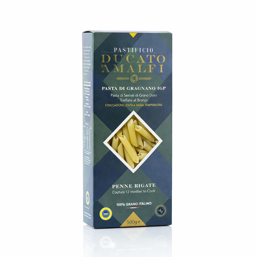 Penne Rigate z Gragnano IGP to klasyczny włoski makaron w formie żłobionych rurek, produkowany przez Pastificio Ducato d’Amalfi. Powstaje z najwyższej jakości semoliny durum i wody z gór Monti Lattari. Dzięki formowaniu w matrycach z brązu posiada porowatą powierzchnię, która doskonale chłonie sosy. Idealny do Arrabbiaty, sosów śmietanowych, zapiekanek (Pasta al Forno) oraz sałatek. Zawsze sprężysty i al dente.